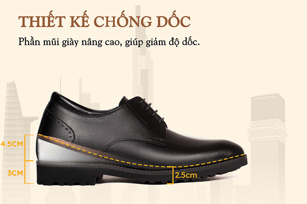 + Cao 7cm (đế ngoài 3cm và lót ẩn 4.5cm): độ dốc thấp, thích hợp với tần suất dùng mỗi ngày.
