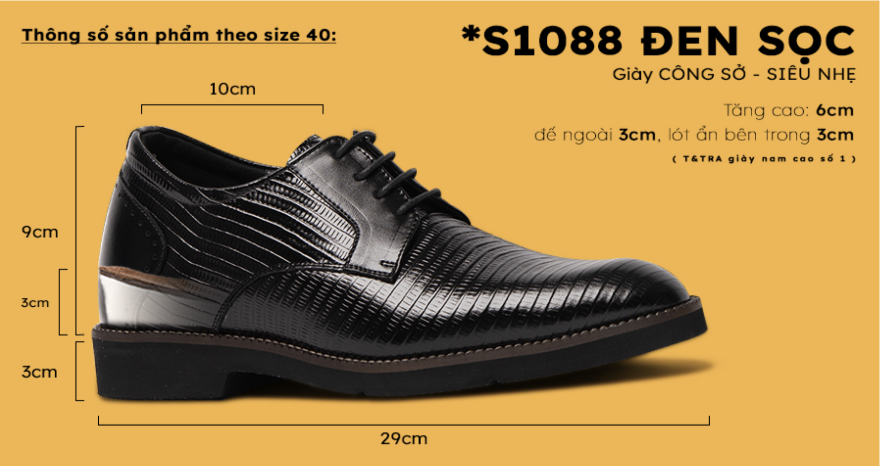 - Tăng cao 6cm: Đế ngoài 3cm, phần cao ẩn bên trong 3cm