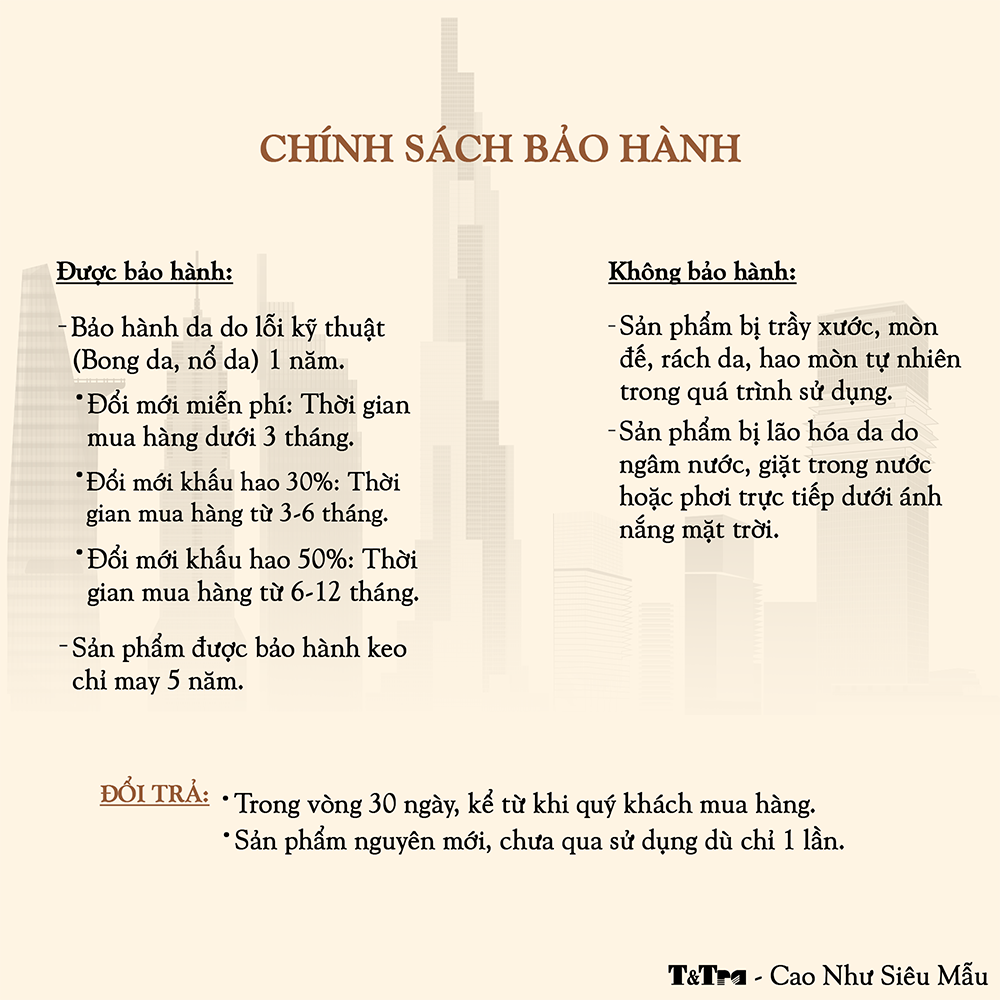- Lớp da mặt: da bò cao cấp, độ dày 1.4 - 1.6mm, bền bỉ theo thời gian, càng dùng càng dẻo dai.