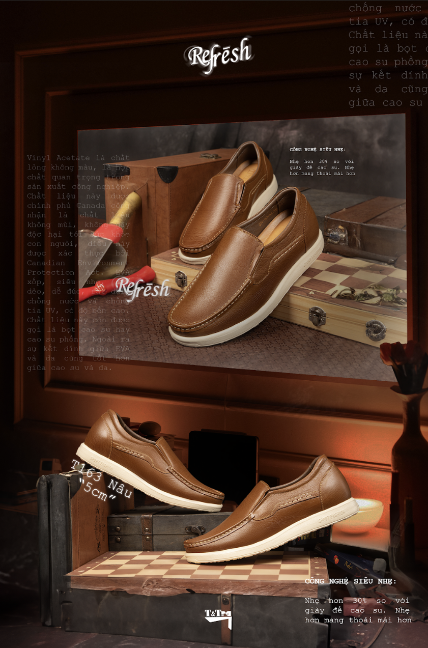 - Trọng lượng giày tăng chiều cao nam T163 Nâu Bò Sần chỉ nặng khoảng 270 gram/chiếc sẽ bằng với trọng lượng 1 chiếc dép do dùng đế và lót tăng cao bằng vật liệu siêu nhẹ EVA.