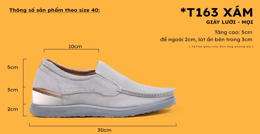 - Trọng lượng giày tăng chiều cao nam T163 Xám chỉ nặng khoảng 250gram/chiếc sẽ bằng với trọng lượng 1 chiếc dép do dùng đế và lót tăng cao bằng vật liệu siêu nhẹ EVA.