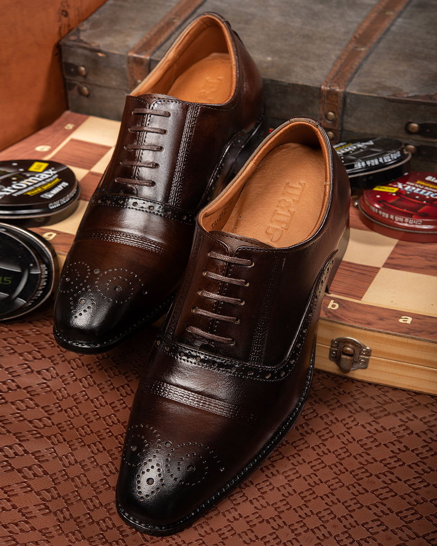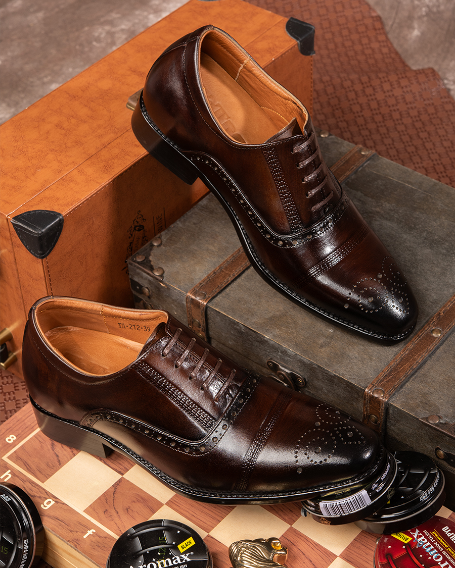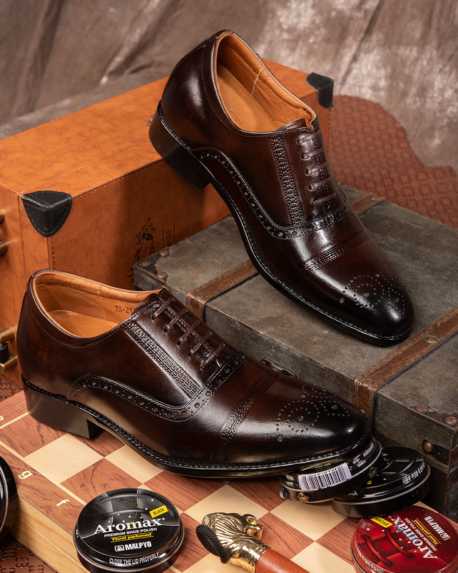 - Khi đi làm, với một đôi giày đế cao nam Oxford hay Derby đánh màu thủ công Patina dù đứng cạnh đồng nghiệp hay xã giao cùng đối tác, anh sẽ luôn phong độ, tự tin mà chẳng sợ bị lép vế.
