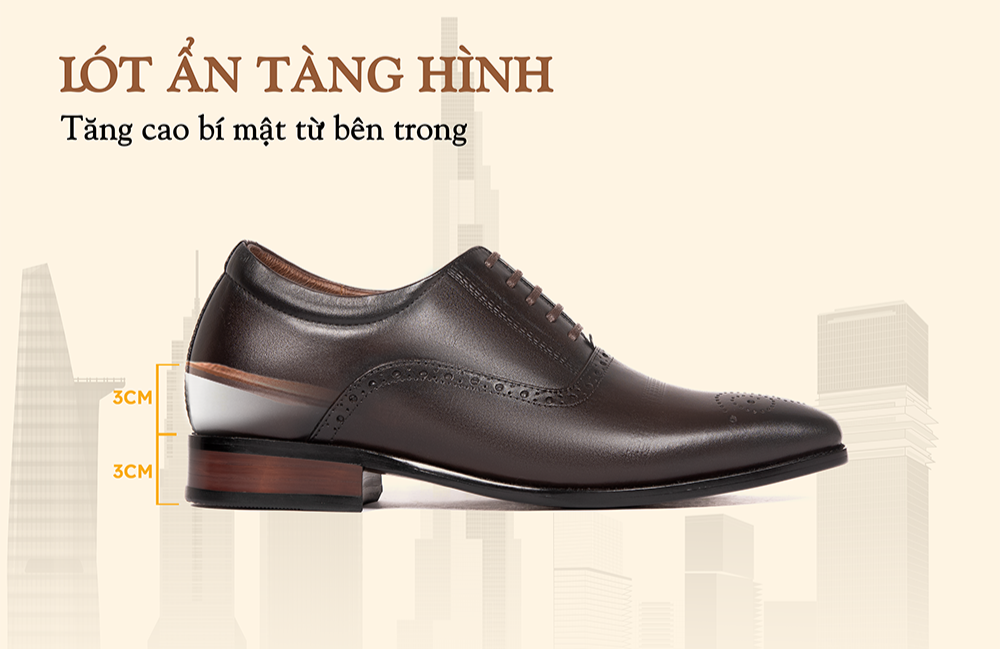 - Sản phẩm tích hợp tính năng tăng chiều cao kép gồm đế ngoài 3cm và lót ẩn 3cm, nâng tổng chiều cao lên đến 6cm
